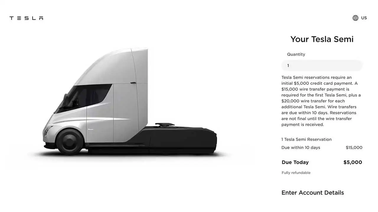 Tesla Semi 预定需求初始 5,000 美元的信用卡付款。第一辆 Tesla Semi 需求 15,000 美元的电汇付款,每添加一台 Tesla Semi 需求 20,000 美元的电汇付款。电汇应在 10 天内到位。在收到电汇付款之前,预定不被终究承认。