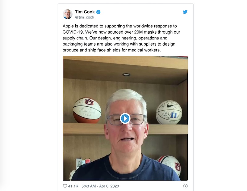 Tim Cook:苹果已捐 2000 万只口罩,每周将出产 100 万个防护面罩